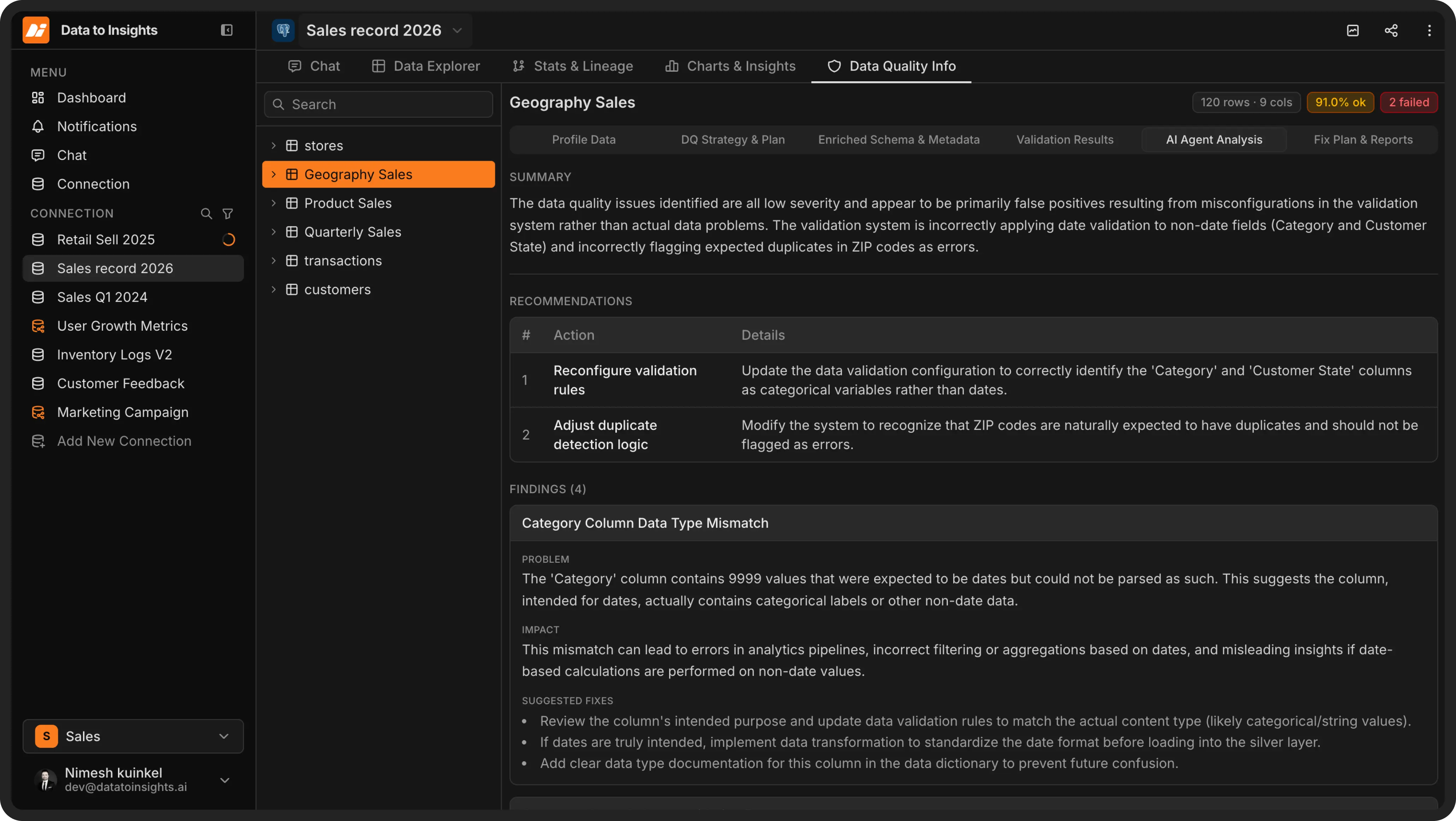 DataToInsights connects to your data sources, intelligently profiles datasets, automates data quality checks, and enforces governance and lineage guardrails — ensuring every AI-driven workflow is trusted, explainable, and ready to scale.